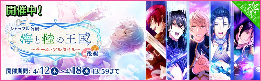 【予告】4/12(木)14時より、「海と陸の王国(後編)イベント」開催!イベント対象楽曲をプレイして、「アルタイルチケット」や「豪華な花束」、「ドリームバッジ」など豪華報酬をGETしましょう! ycast.sega-net.com/news_detail01/… #夢キャス