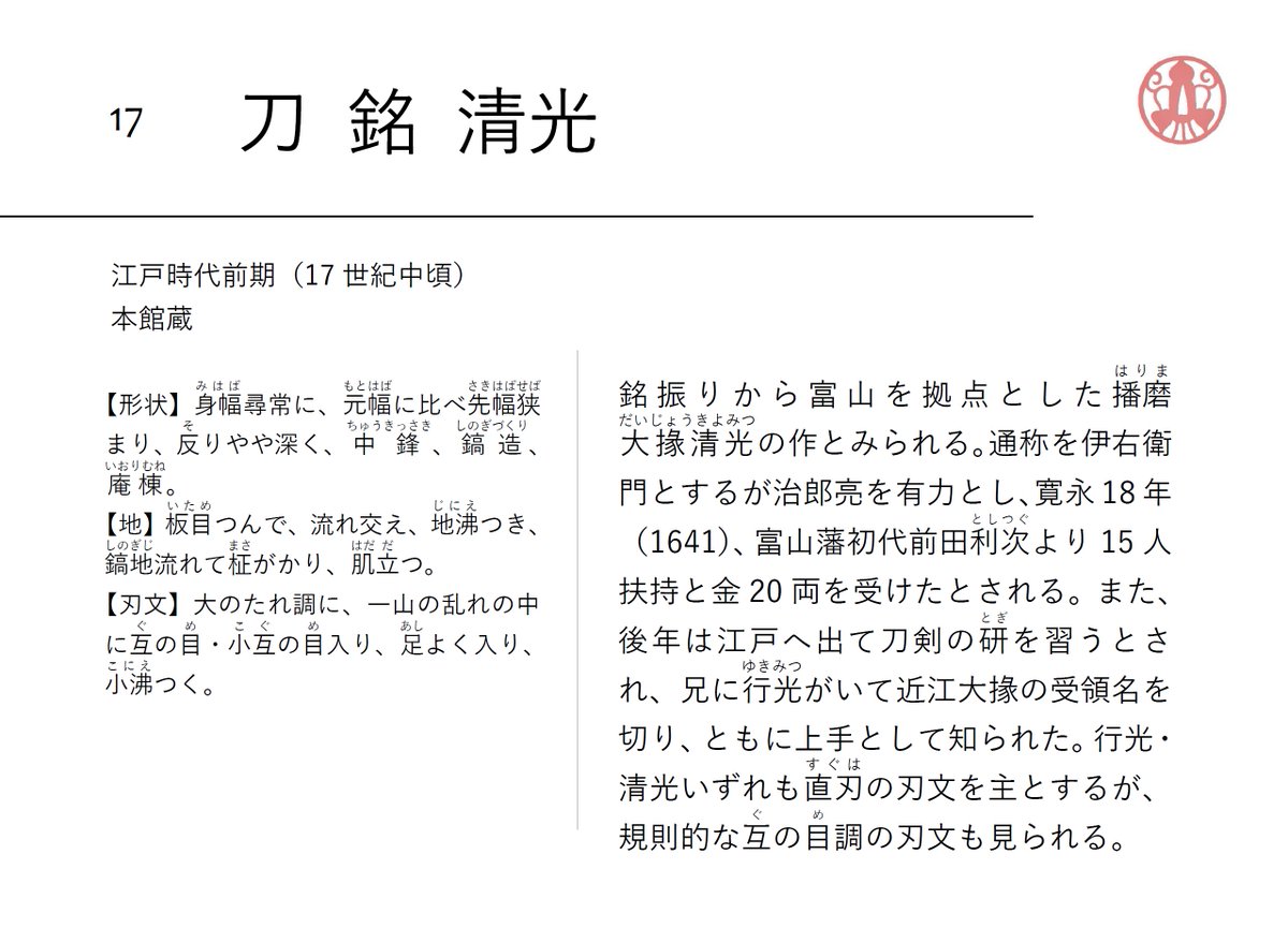 本日は新刀期の加賀を代表する刀工、初代兼若(甚六兼若)をご紹介します。江戸時代初期に刀の名産地・美濃国から来住したとされ、その技量の高さは全国版の刀工番付に名を連ねるほど。「兼若」の名はその後、彼の子孫に受け継がれていきました。画像は当館所蔵の刀です。#大加州刀展
