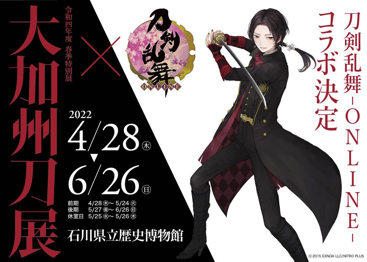 7/22から開幕する「#大加州刀展」(石川県立歴史博物館)の開催を記念し「刀剣乱舞-ONLINE-」とのコラボが決定しました。刀剣男士 加州清光の等身大パネル設置、コラボグッズの販売など行います。そして、音声ガイドも実施!詳細は下記HPをご覧ください。daikashutouten2021.com