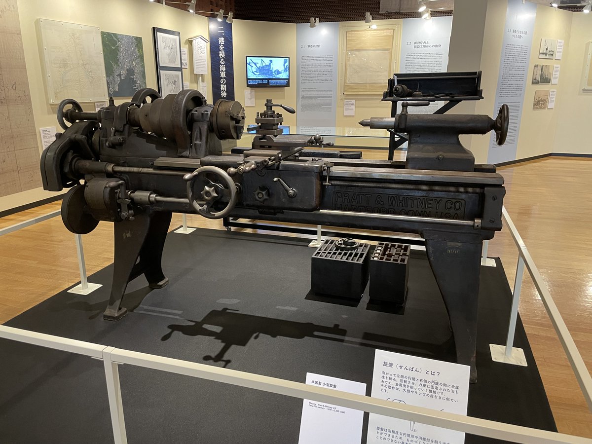 写真は、企画展に展示中の米国製の小型旋盤。旋盤は高精度な円筒形や円錐形を削り出すことができるため、ものづくりの現場では欠くことのできない基本的な工作機械の一つです。