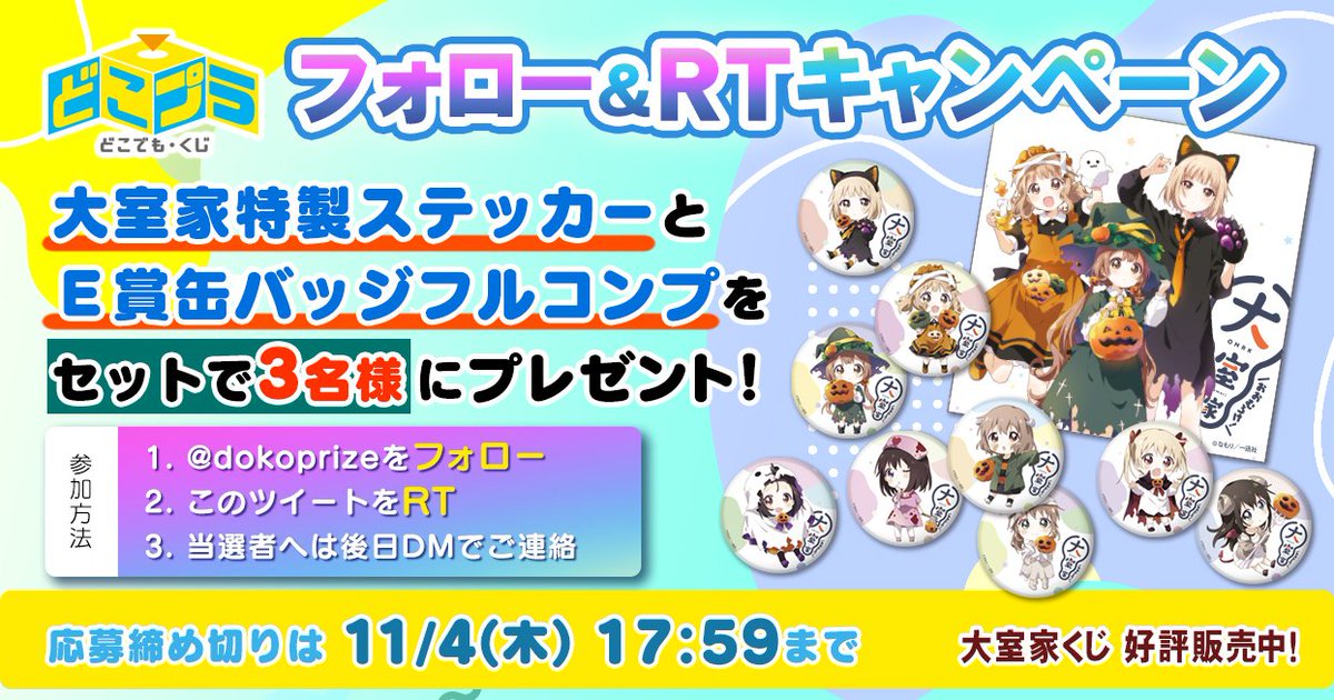 #大室家 くじ フォロー& #RTキャンペーン🎉 (締切は11/4(木) 17:59まで) \ 抽選で3名様に「E賞BIG缶バッジフルセット」と「特製ステッカー」を #プレゼント 🎁 ※ステッカーは、購入特典と同じものです。 参加方法 1⃣ @dokoprize をフォロー 2⃣ このツイートをRT 3⃣ 当選者へは後日DMでご連絡📩