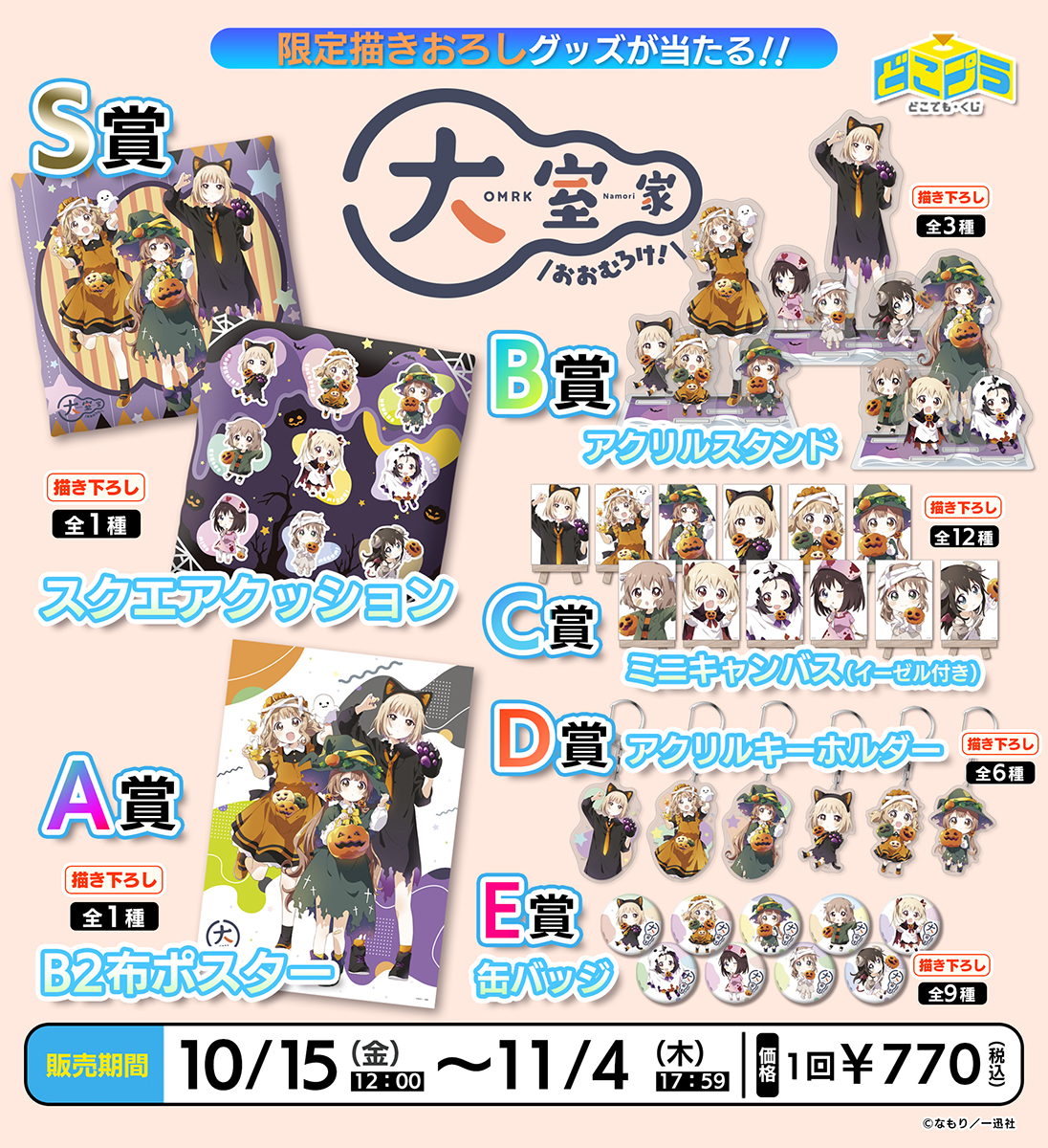 大人気ホームコメディマンガ「#大室家」のオンラインくじが、10月15日(金)12:00から販売開始🎁 景品イラストは全て、原作者・なもり先生(@_namori_)の描き下ろし!可愛いハロウィンコスプレをした大室家三姉妹たちのアイテムが手に入るこの機会をお見逃しなく!⏰ dokoprize.com #どこプラ