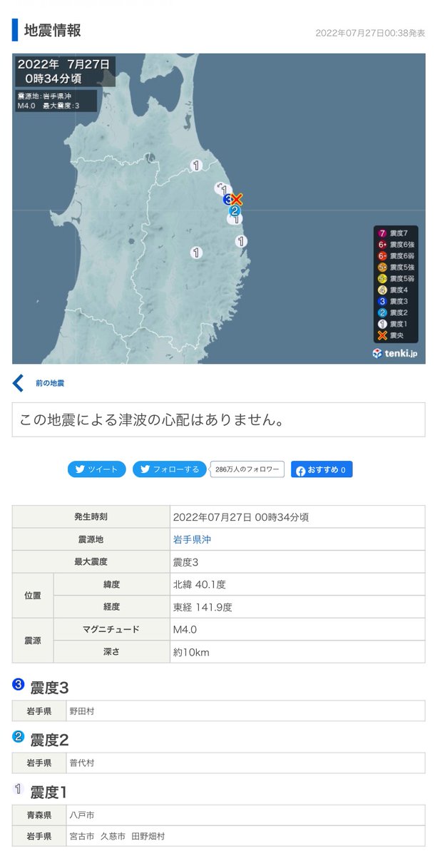 27日0時34分頃、岩手県で最大震度3を観測する地震。震源地は岩手県沖、M4.0。