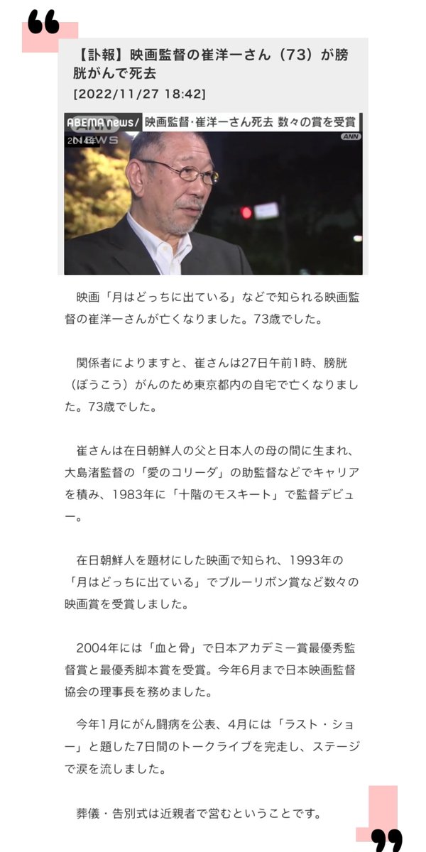 【訃報】映画監督の崔洋一さん(73)が膀胱がんで死去