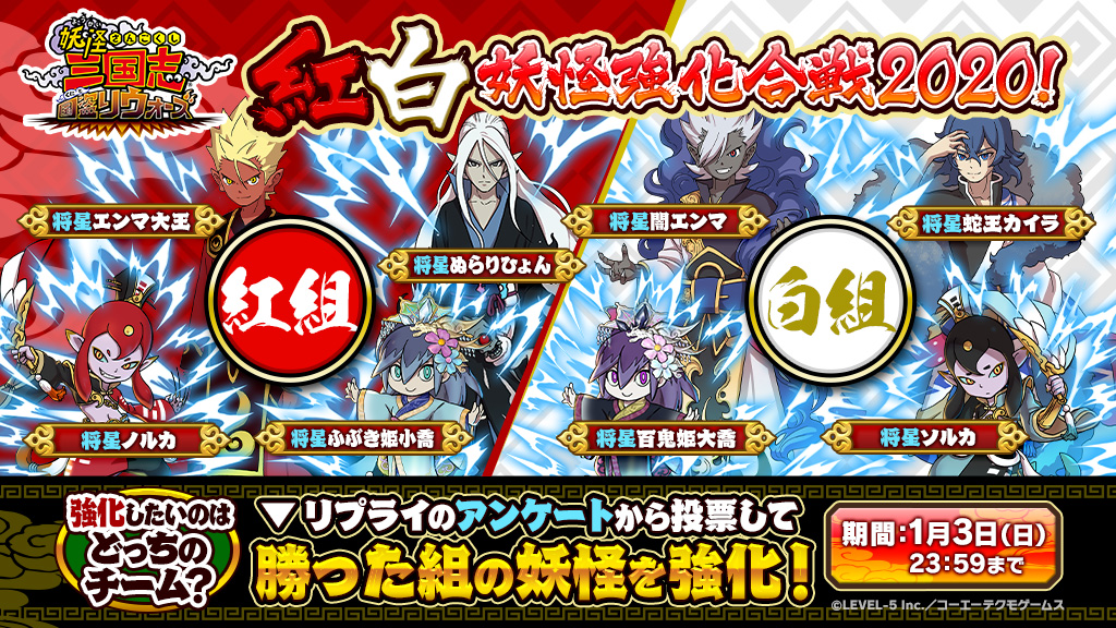 「紅白妖怪強化合戦2020!」開催!リプライのアンケートで勝った組の将星妖怪たちを、今後のアップデートで強化するよ!期限は1/3(日)23:59まで!ぜひ参加してね! #妖怪三国志