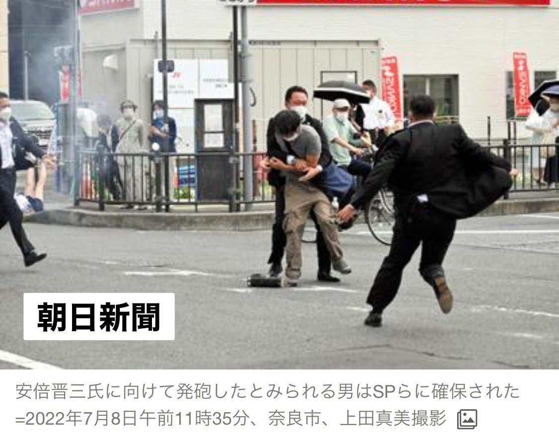 8日11:30頃、奈良・近鉄の大和西大寺駅前で街頭演説中に散弾銃(ショットガン)のようなもので左胸を後ろから2発撃たれた。現在意識不明で心肺停止の状態。銃は押収された。