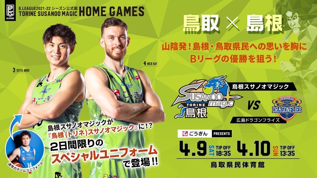 4/9(土)、4/10(日)🆚広島(鳥取市開催)では、山陰発!島根・鳥取県民への思いを胸にBリーグの優勝を狙う🔥特別ユニフォームで戦います💪🍐
