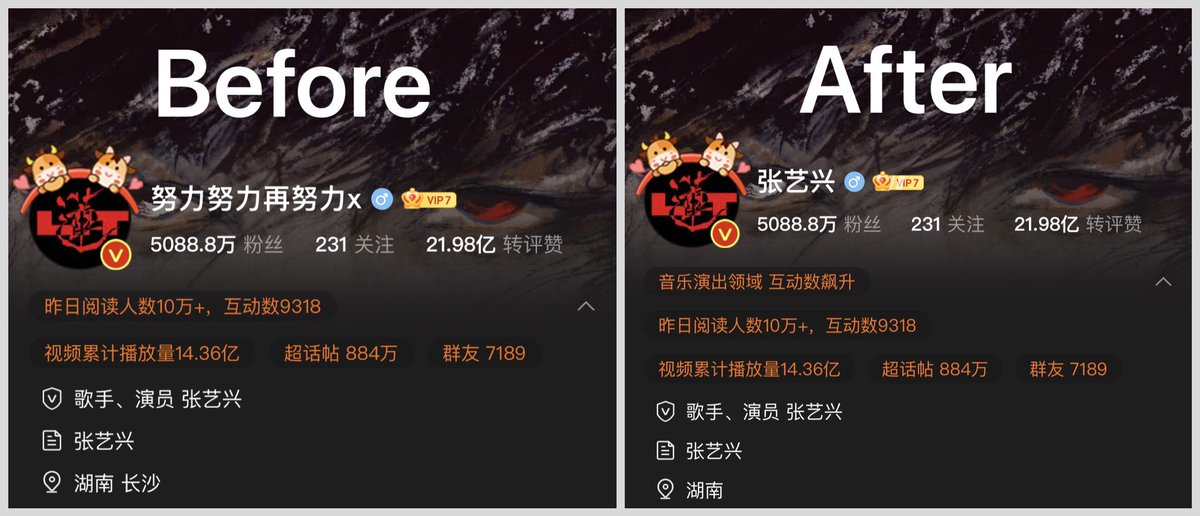 Yixing changed his weibo name from "努力努力再努力x" (work hard, harder and even harder x) to "张艺兴" (Zhang Yixing).