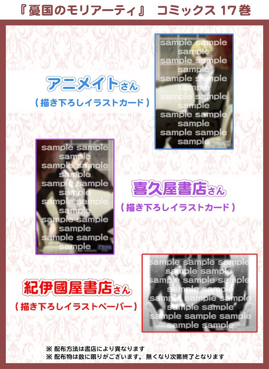 Moriarty the Patriot『#憂国のモリアーティ』เล่ม 17 (ฉบับภาษาญี่ปุ่น) ที่จะวางจำหน่ายในวันที่ 4 เมษายน 2022 นี้ー หากสั่งซื้อจากร้าน Animate จะได้โปสการ์ดแถมเป็นภาพของผมนะครับ (เป็นภาพลงสีครึ่งหนึ่งจากโปสการ์ดแถมเล่ม 17 ของร้าน Kinokuniya) animate-onlineshop.jp/pd/2058706/🌹