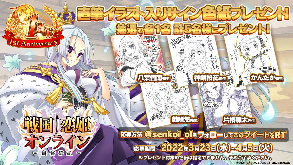 『戦国†恋姫EX参』クラブネクストン公開を記念して「#森永有栖」さんの直筆サイン色紙を1名様にプレゼント!