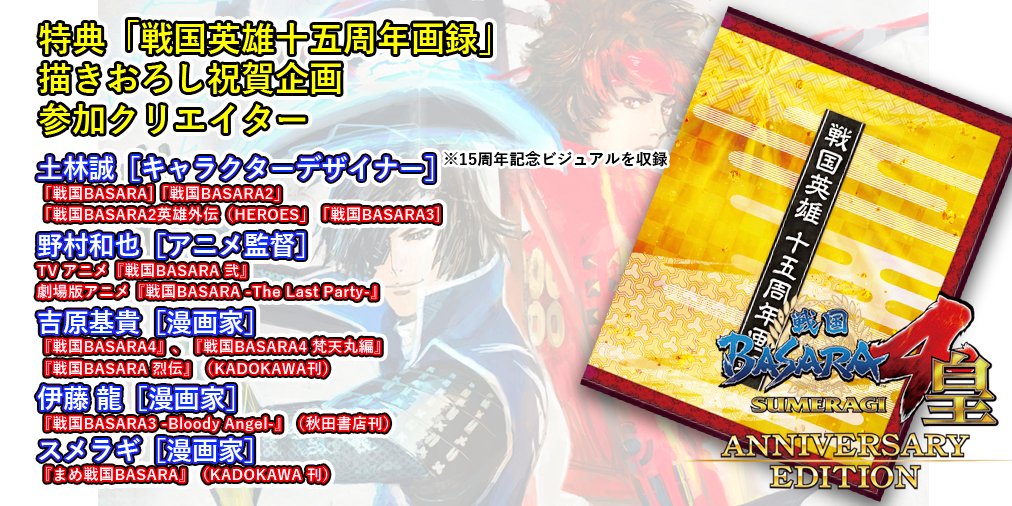シリーズ15周年を記念した『戦国BASARA4 皇 ANNIVERSARY EDITION』のイーカプコン限定版では、キャラクターデザインを手がけた「土林 誠」氏描き下ろし15周年記念ビジュアルの特製タペストリーがセットに!ただいま予約受付中です! e-capcom.com/shop/g/gC00005… #戦国BASARA