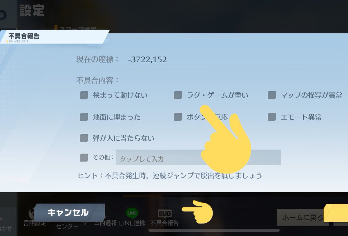不具合報告のボタンに新規に、「ラグ・ゲームが重い」のボタンを追加しました。