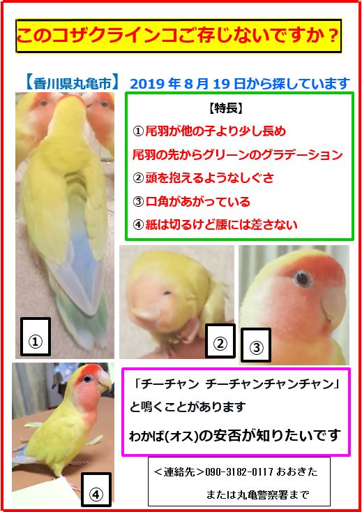 皆様 今年もわかば捜査ご協力ありがとうございました 心よりお礼申し上げます 2019.8.19香川県丸亀市今津から迷子の黄色い小桜インコわかばを捜しています #迷い鳥 #迷子  #拾った #香川県 #丸亀市 #今津 #津森 #金倉 #多度津 #善通寺 #坂出 #コザクラインコ #ボタンインコ