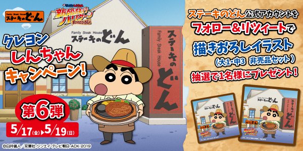 映画クレヨンしんちゃんとのコラボキャンペーンもとうとう最後!!第6弾🤣 フォロー&リツイートで、どどーん!とオリジナル描きおろしイラストをセットで1名様にプレゼント🎊🎊🎊 ステーキのどんのステーキを持ったしんちゃん可愛い💕