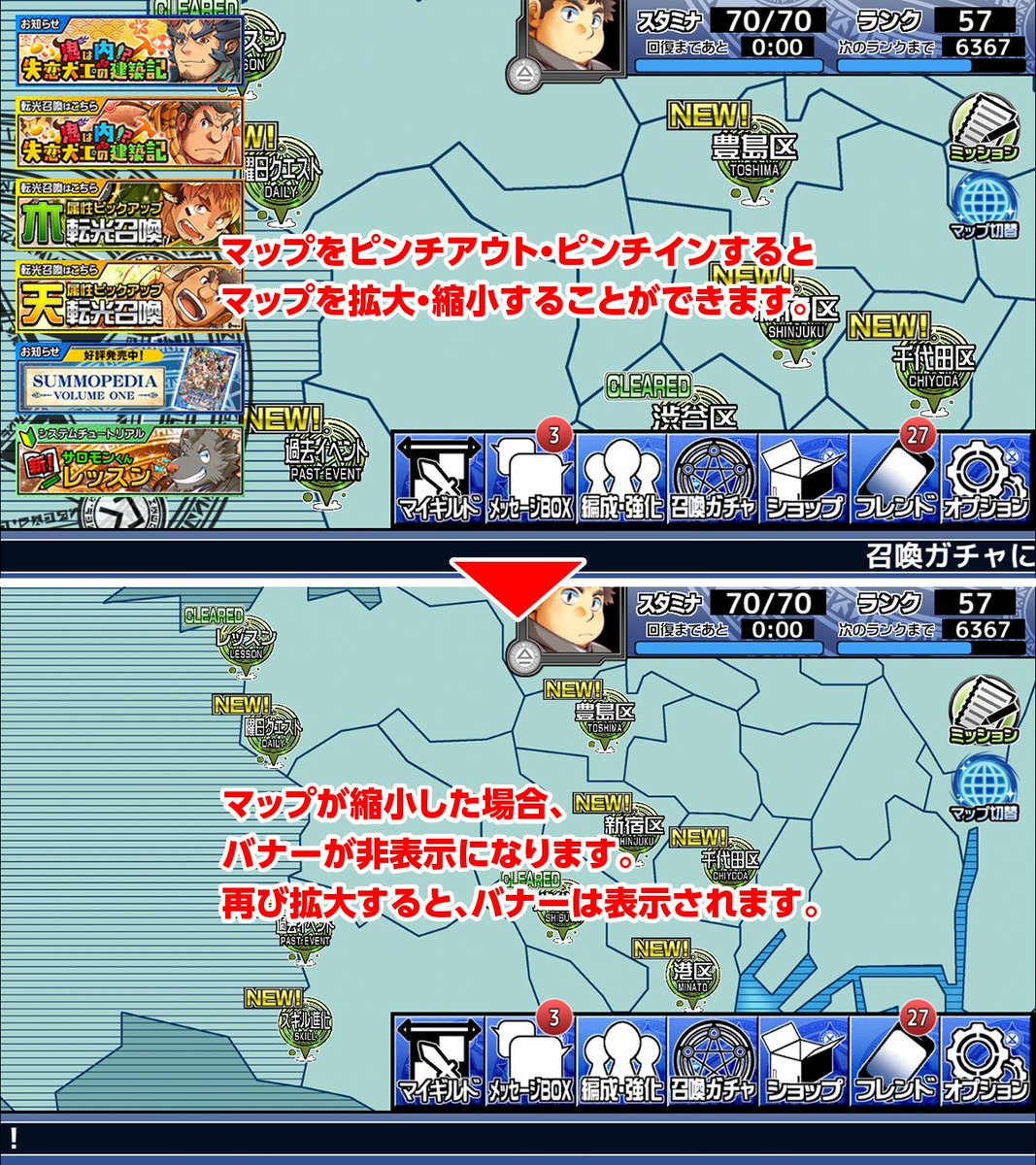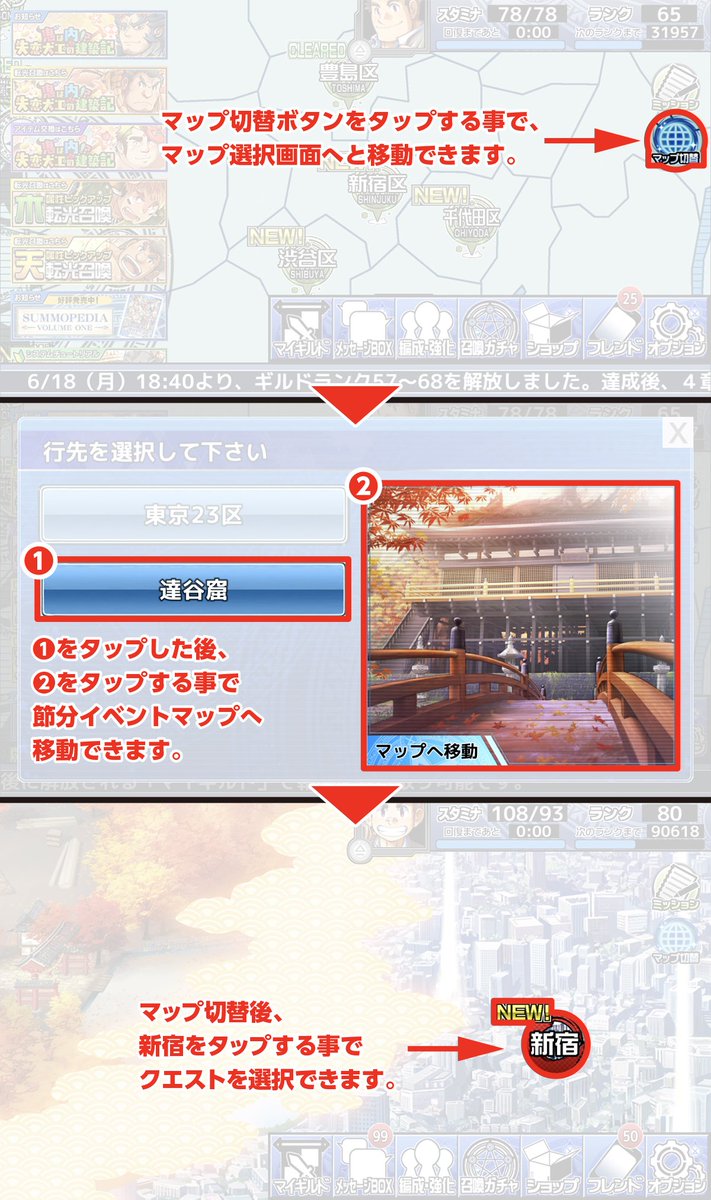 【お知らせ】イベント中、新たに「マップ切替機能」が登場します。トップ画面からマップ切替ボタンをタップすると、イベント専用のマップに移動できるようになります。また、マップ画面でピンチアウトをすることでマップの拡大縮小ができる機能が追加されました。bit.ly/2RCJWYP #放サモ