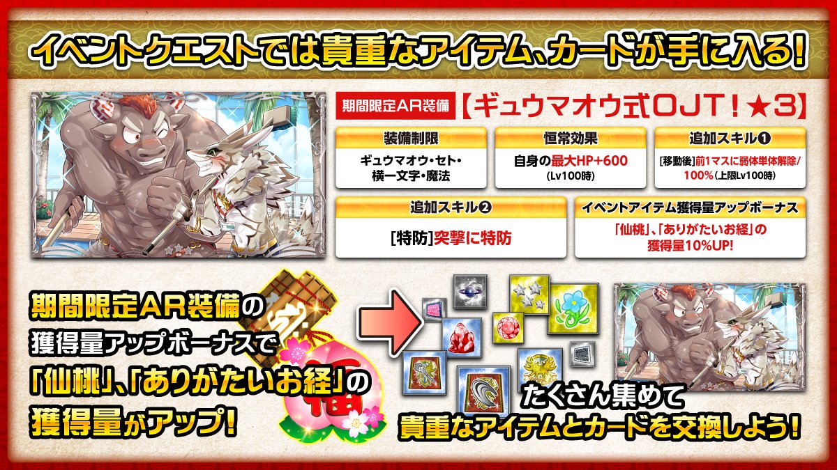 【お知らせ】東京放課後サモナーズ、期間限定イベント「【復刻】デザート☆ジャーニー ~西の彼方で逢いましょう~」では、イベント限定AR装備「ギュウマオウ式OJT!(★3)」が登場します!アイテム交換所で入手可能です。詳細はこちら。 bit.ly/3eWCBes #放サモ