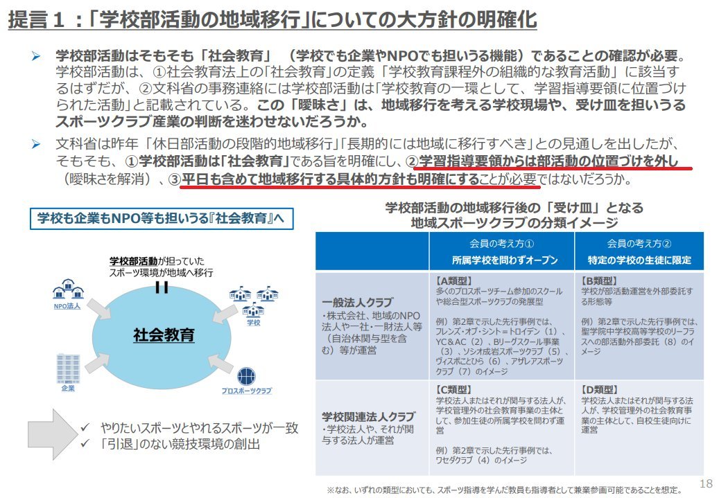 ・学習指導要領から部活動の位置づけを外して「学校教育の一環」などという「曖昧さ」を解消すること