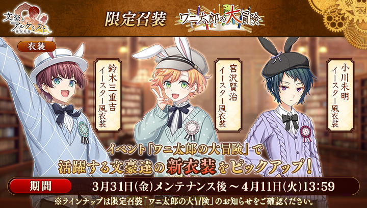 調査任務「ワニ太郎の大冒険」で活躍する文豪達の衣装をピックアップいたします。