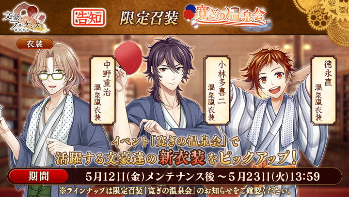 イベント『調査任務「寛ぎの温泉会」』(5/12~5/23開催)で獲得できる、堀辰雄の<衣装>温泉風です。