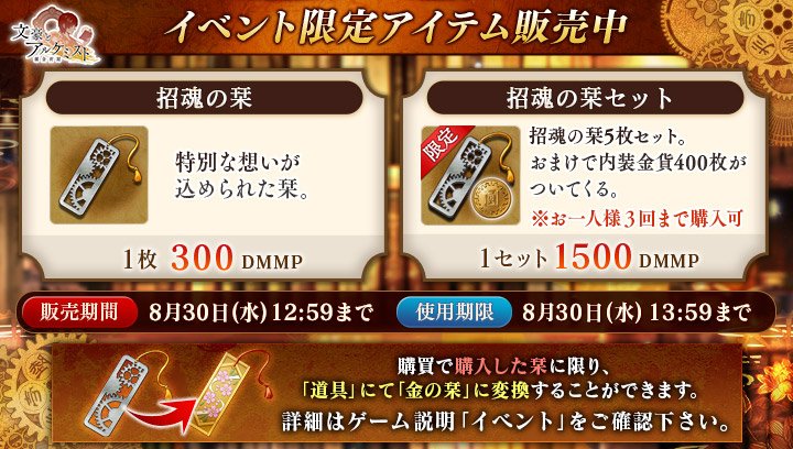 正:招魂の栞5枚セット。おまけで金貨400枚がついてくる。 twitter.com/BunAl_Staff/st…