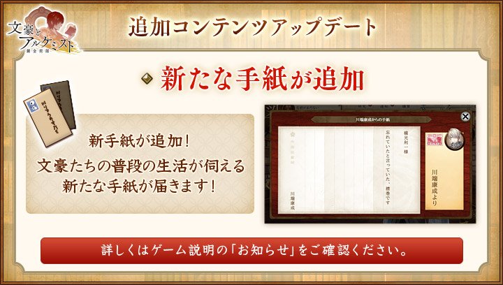 詳細な内容につきましてはゲーム内のお知らせをご確認ください。 #文アル
