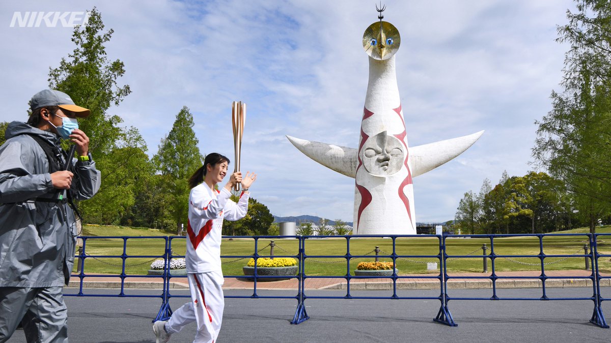 東京五輪の聖火リレーが13日、大阪府で始まりました。#新型コロナウイルス の感染再拡大を受けて公道での開催が初めて中止となり、代替措置として「太陽の塔」のある万博記念公園内を周回するコースとなっています=目良友樹撮影