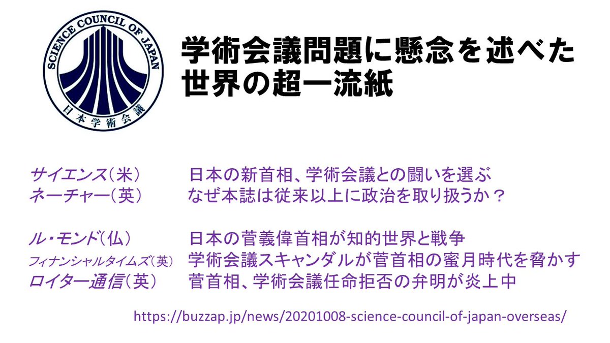 一応言っておきますが、菅前政権による会員任命拒否に際し、名だたる海外一流メディアは驚きと懸念を示す報道を行いました。