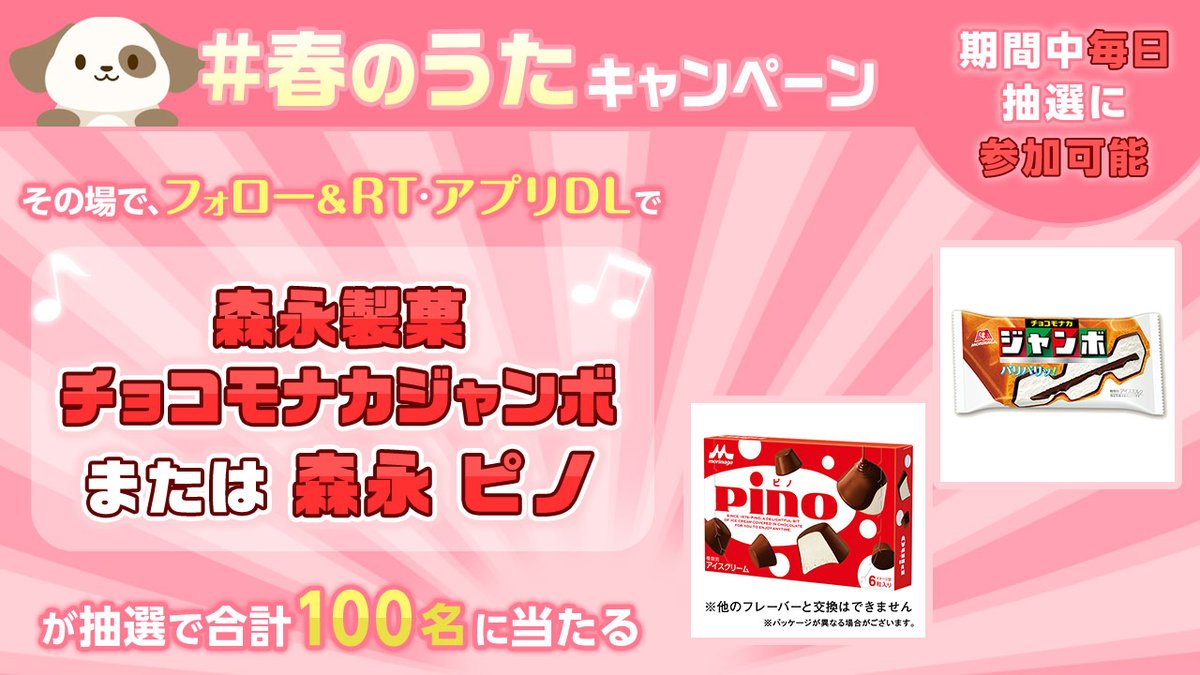 【アプリ限定】 \3キャンペーン同時開催中/ #春のうた キャンペーン3/22まで 抽選でお好きな方が100名様に🎁 ★森永製菓 チョコモナカジャンボ ★森永 ピノ ⚠️ #ハピけん アプリが必要です⚠️ ①@dgift_app をフォロー ②翌日12:59までにこの投稿をRT ③下記URLから応募 bit.ly/3Ku2j9h