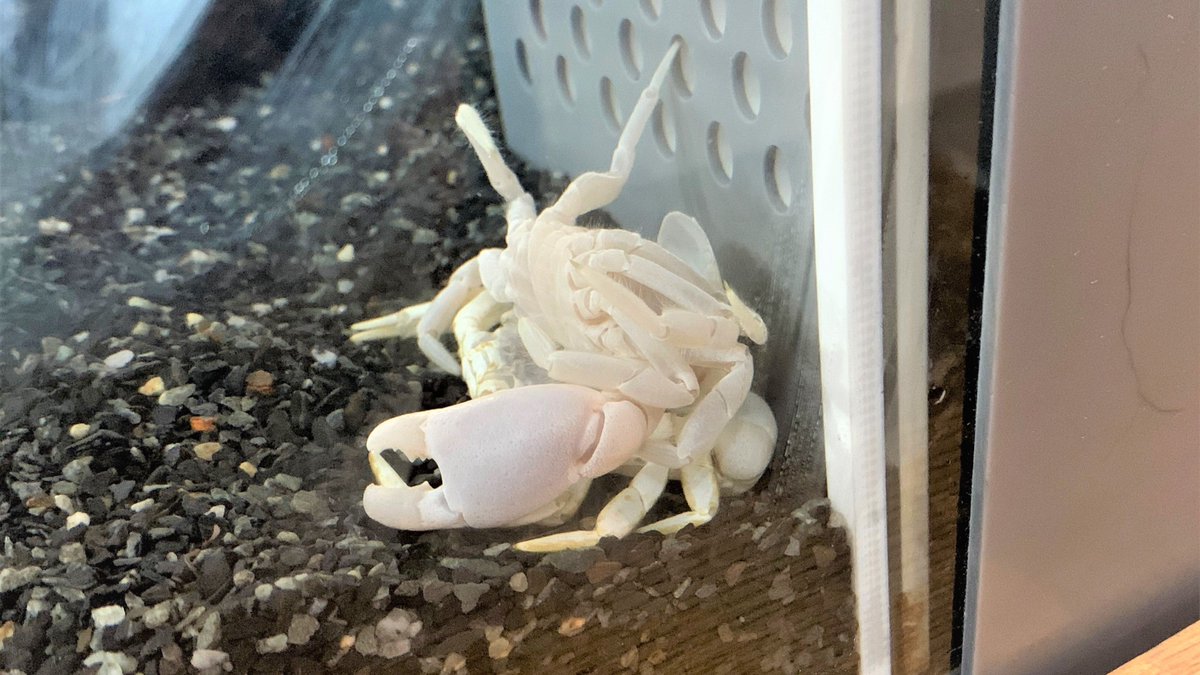 本日13時過ぎ、#未来館 常設展示5階「フロンティアラボ」に展示されているユノハナガニ、田吾作(だごさく・男性・年齢不明)が水槽の中で脱皮しているところが、担当職員によって発見されました。