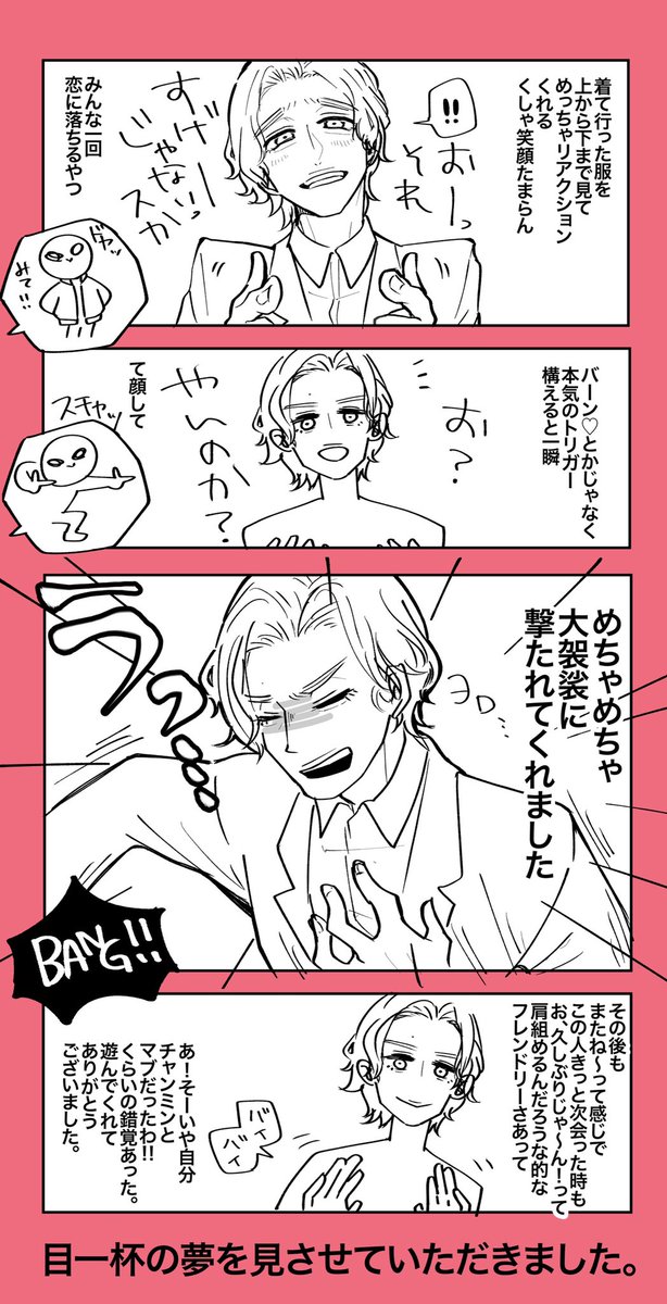 XVのチャンミンのコスして行ったら入った途端お馴染みのくしゃっとした八の字眉で上から下まで(´^ J ^`)お~!やるじゃん!!みたいに見てくれた後、こちらが渾身のTrigger一発ぶち込んだら胸を抑えて大袈裟に(´Φ JΦ`)ウッ…!って撃たれたふりして遊んでくれて死ぬかと思った