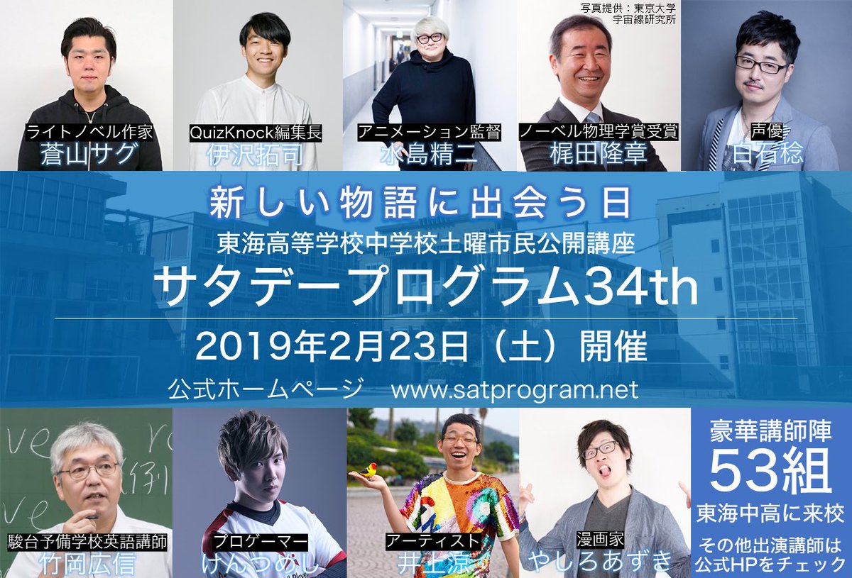 【速報板公開!】公式HPにてサタデープログラム34thの速報板(講師一覧)を公開しました。 講座内容は後日改めて発表しますのでどうぞお楽しみに! #サタプロ #東海高校 #東海中学校 satprogram.net/sokuhouban.html