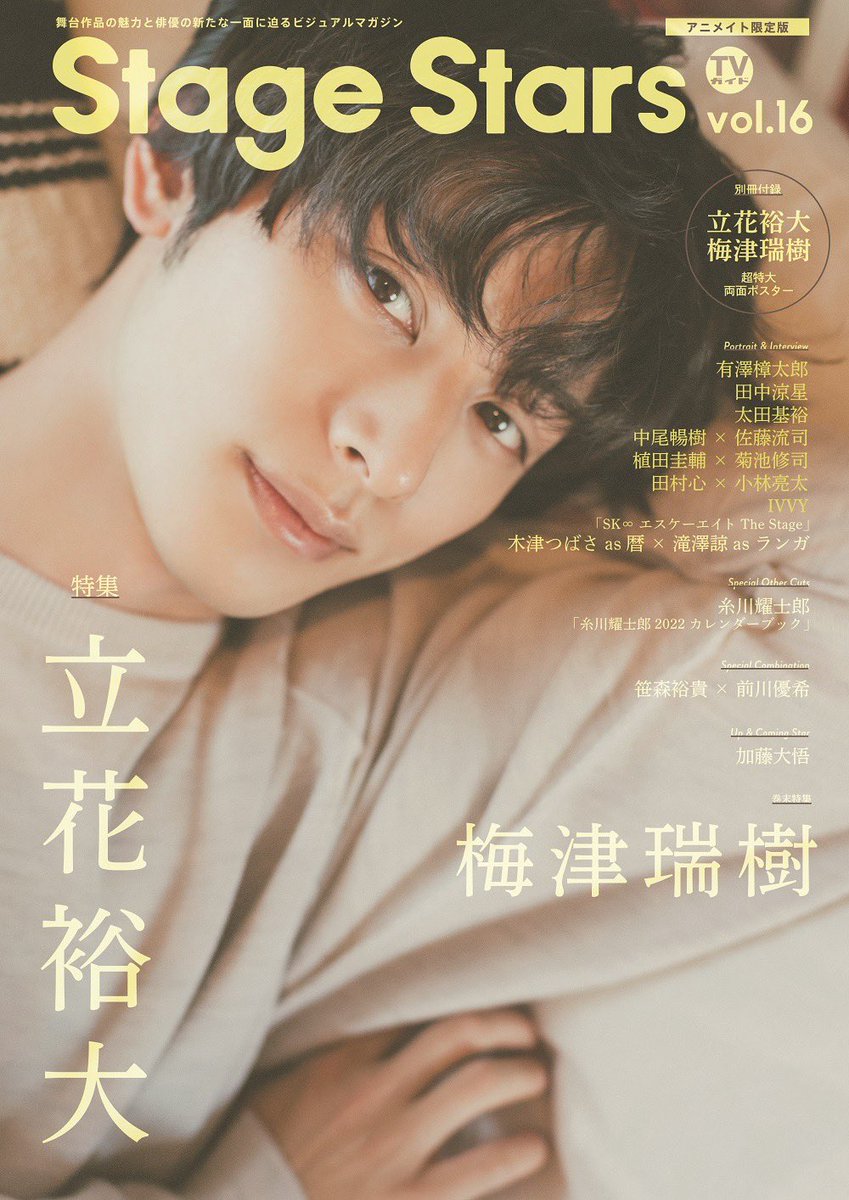 【「#TVガイドStageStars vol.16」11/27発売】アニメイトで通常版をお買い求めいただくと、 #立花裕大 さん(@yuta_tachibana_)、#梅津瑞樹さん(@MizukiUmetsu)の本誌未掲載カットによる生写真をセットでプレゼント!なお、数に限りがあるのでお早めに。ご予約はanimate-onlineshop.jp