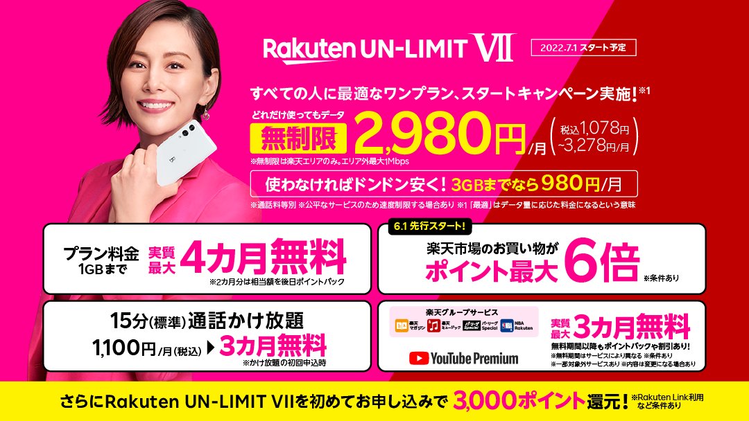 #楽天モバイル は本日、月2,980円(税込3,278円)でデータ使い放題はそのまま、楽天グループの対象サービスがおトクになる「Rakuten UN-LIMIT VII」を発表しました!※新規お申し込みは7/1から
