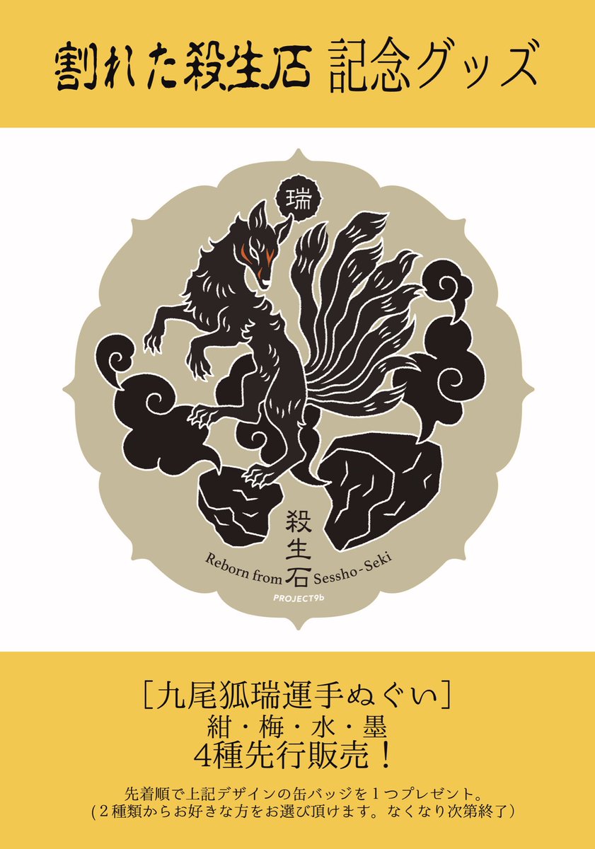 【割れた殺生石記念グッズ先行発売決定】 先月那須の #殺生石 が割れた事により #九尾狐 慰霊祭並びに平和記念祭が行われましたがその記念グッズが発売になります! 蓮華をあしらった九尾狐が舞い踊るデザインの瑞運手ぬぐいと缶バッジ。那須に先駆けて「四天神狼」個展で先行販売できる事になりました