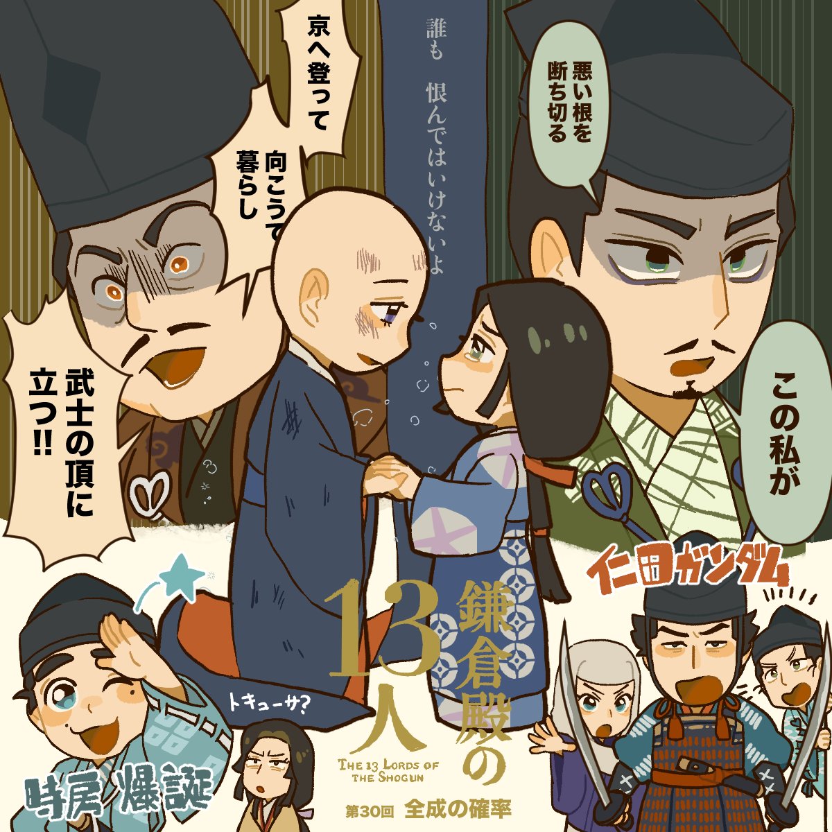 実朝の教師陣。弓と槍と政治学はともかく女性関係の講義でいつも笑う。これぞ天命