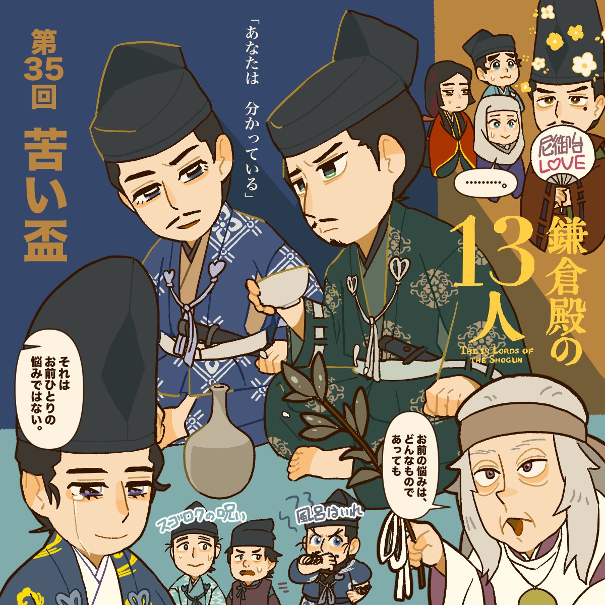 1話目みたいなほのぼの宴会の裏で息子を亡くした一人ぼっちのりく。北条家の中でも修復できない隔絶が生まれてるこの対比がなんとも言えない… #殿絵 twitter.com/kanokiwa/statu…