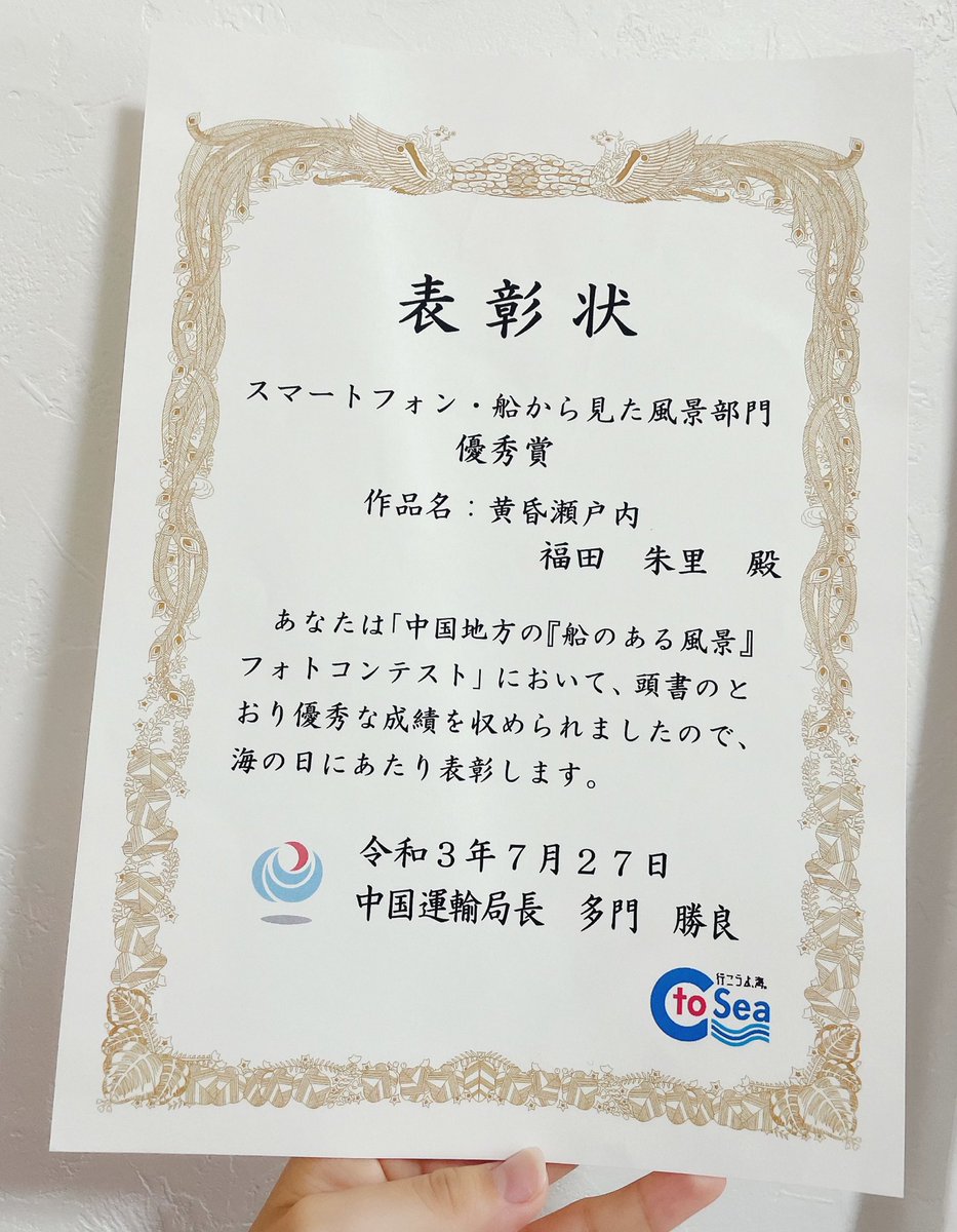 「中国地方の『船のある風景』フォトコンテスト/スマートフォン·船から見た風景部門」で優秀賞を頂きました✨