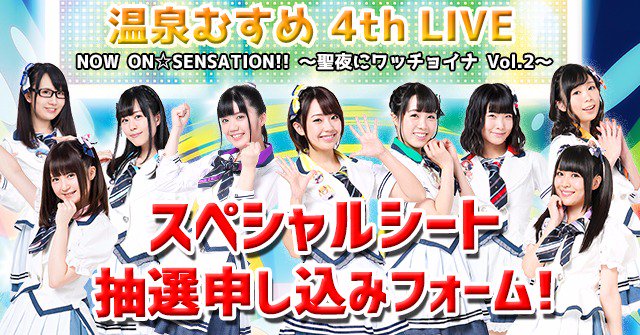 本日より、温泉むすめ 4th LIVEのスペシャルシート抽選申し込みがスタート! 超豪華なメンバーでお届けするライブを前方席で楽しもう✨ チケットの詳しい申し込み方法はコチラから! #温むす