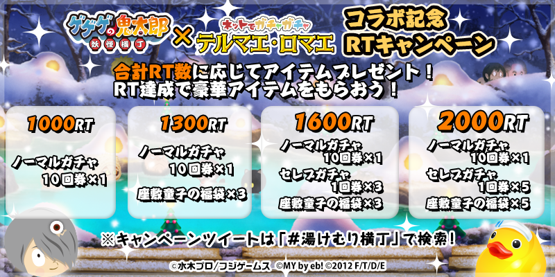 \コラボ記念!RTキャンペーン/ このツイートをRTで全員にゲーム内アイテムをプレゼント! RT数が集まるほどキャンペーン報酬が豪華になります★ 横丁主のみなさまのご参加お待ちしております♪