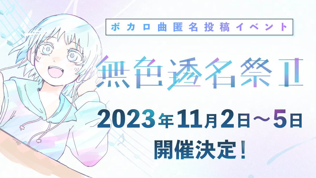 ◤ ◥ 無色透名祭Ⅱ 2023年11月2~5日 開催決定 ◣ ◢ ボカロ曲匿名投稿イベント「無色透名祭Ⅱ」の開催が決まりました! 応募期間や詳しいルールなどはこちら