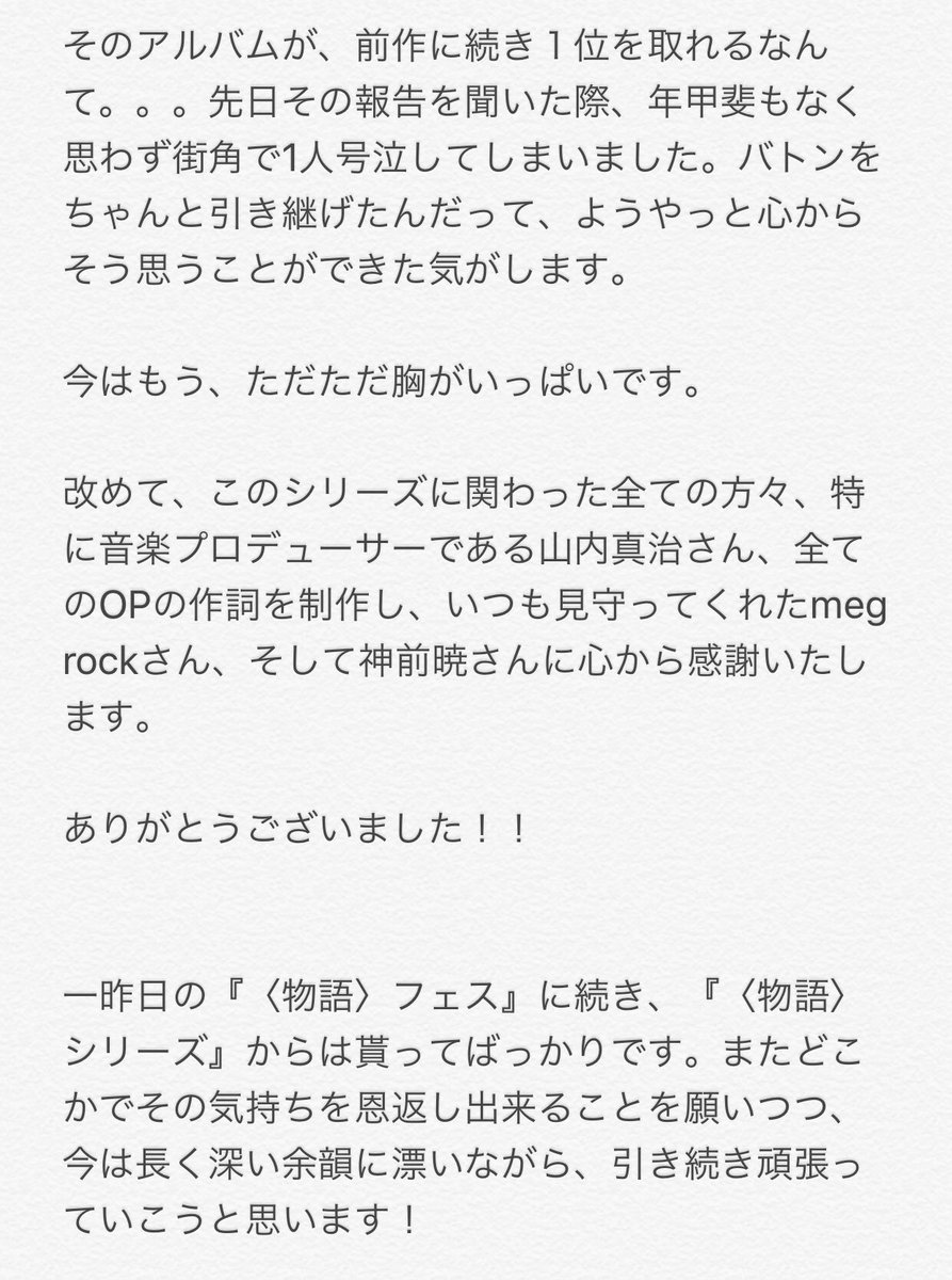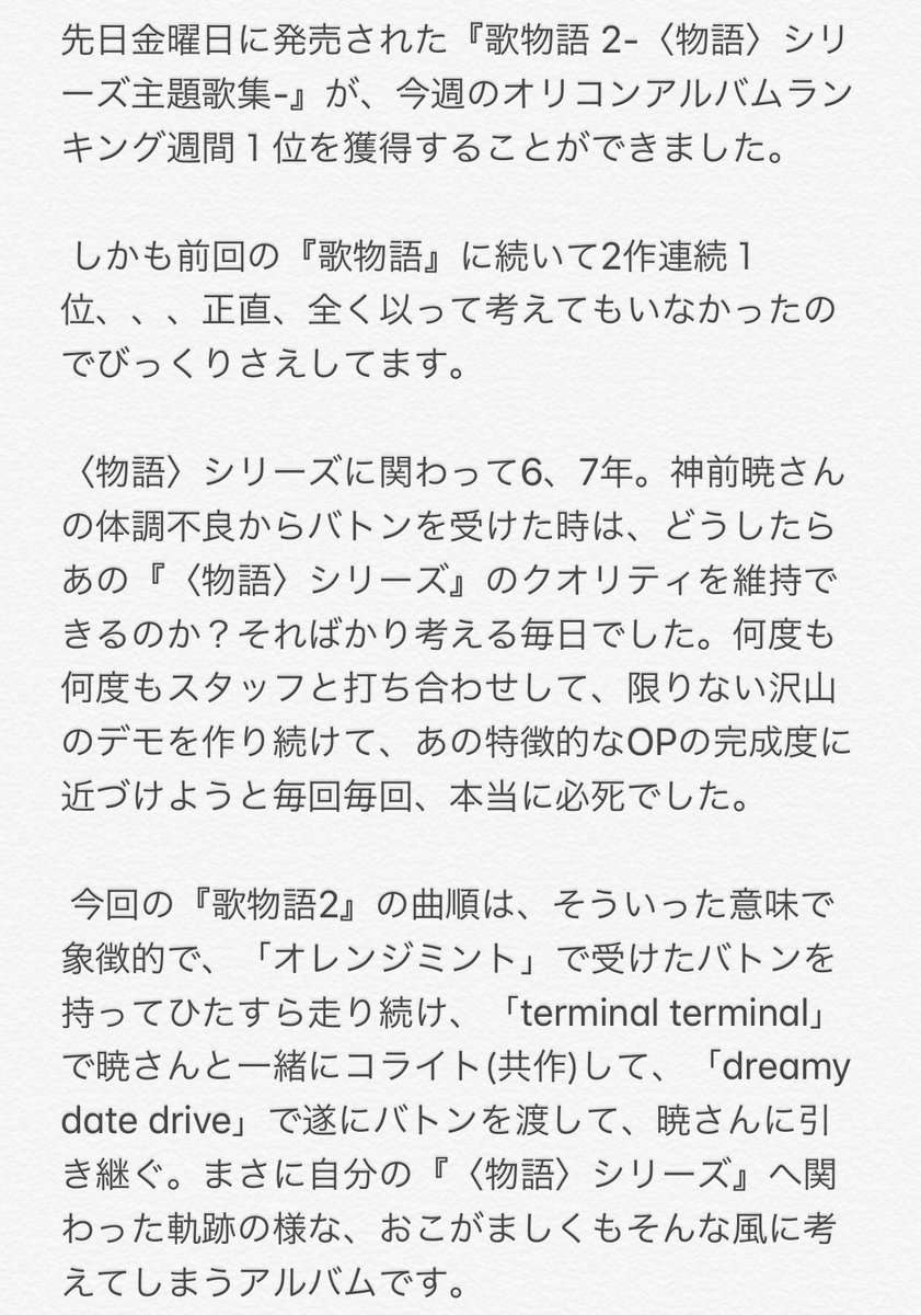 『歌物語2 -〈物語〉シリーズ主題歌集-』がオリコン週間アルバムランキングで1位を獲得いたしました!