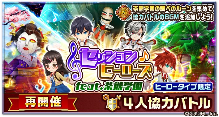 今日から協力バトル「絶佳幻想エボリューション」と「セッションヒーローズ feat.茶熊学園」が再開催されるにゃ(◍•ᴗ•◍)