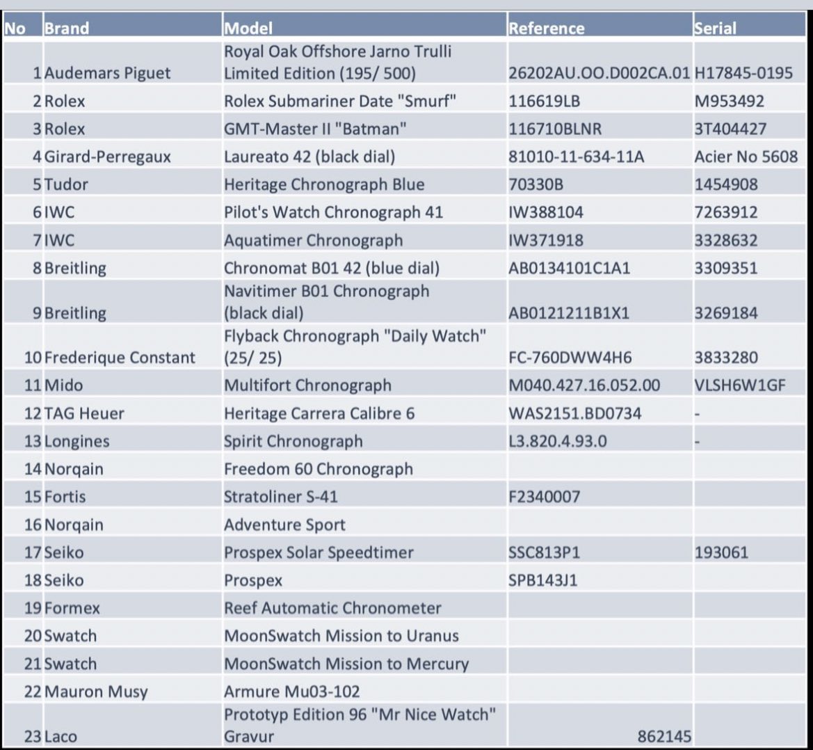 【拡散希望】23日、ドイツ・デュッセルドルフの友人宅に2〜3人の強盗が押し入り彼がコレクションする23本の腕時計が盗まれました。どれも箱と保証書なしでどこかに売られる可能性があります。もしこのシリアルのものを発見したら彼にご一報を! 買取店の方にも届け!