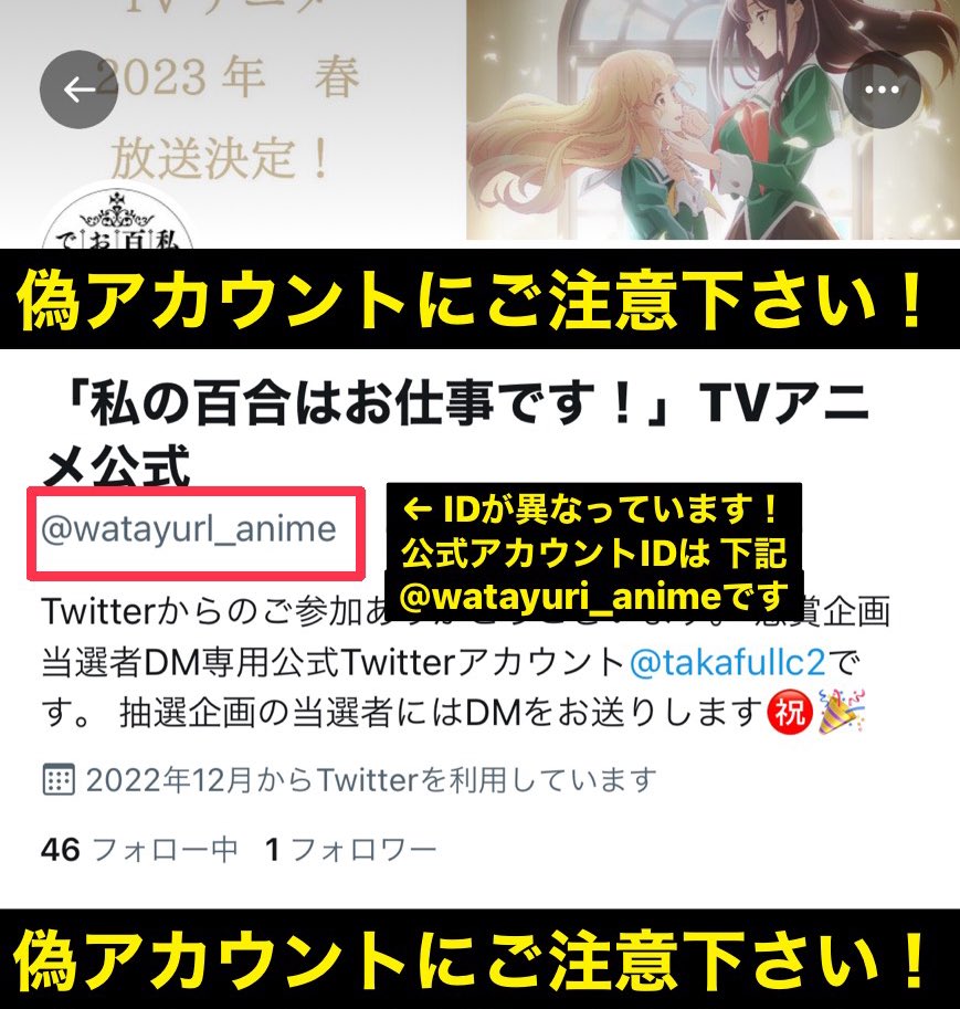 「#私の百合はお仕事です!」公式アカウントを装った偽アカウントが確認されています。特徴は画像をご確認下さい。