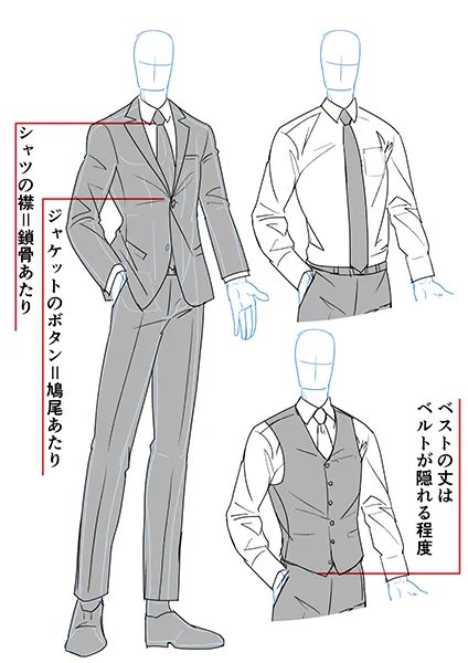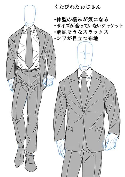 スーツの描き方の基本を踏まえた上で、スーツ姿の若者とおじさんの違いを解説✍️