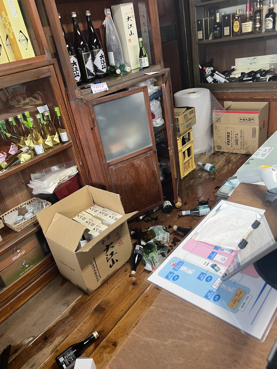 先程の大きな地震は人的被害は無いです。お店の酒が割れ、ヒビがさらに増えたり、家も蔵も古いもので、かなり埃だらけになっちゃいましたが元気です。ちょうどお客様もおらず、良かったと思ってます。まだ余震もあり片付けもあるので返信が遅くなりますが皆様ご安全に!