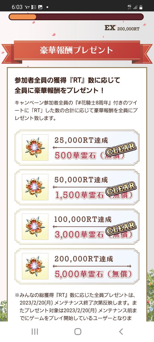 また達成報酬として、「 #花騎士8周年 」のついたツイートの総リツイート数が10万リツイートを超えると、合計5,000個の華霊石ももらえます!