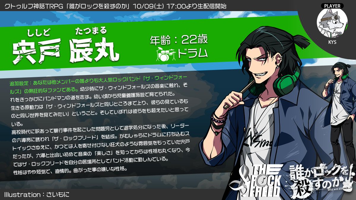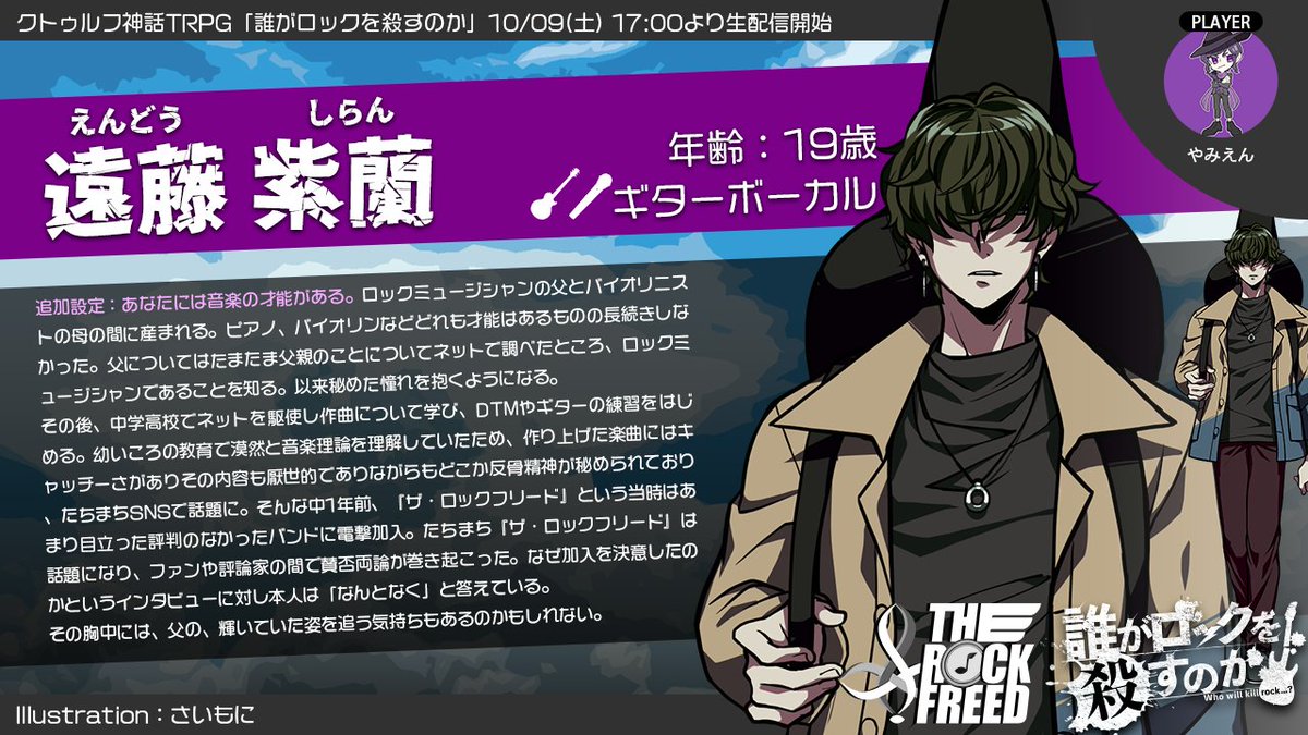10/09(土)17:00から生放送開始のクトゥルフ神話TRPG「誰がロックを殺すのか」でセッションかます4人を紹介します。