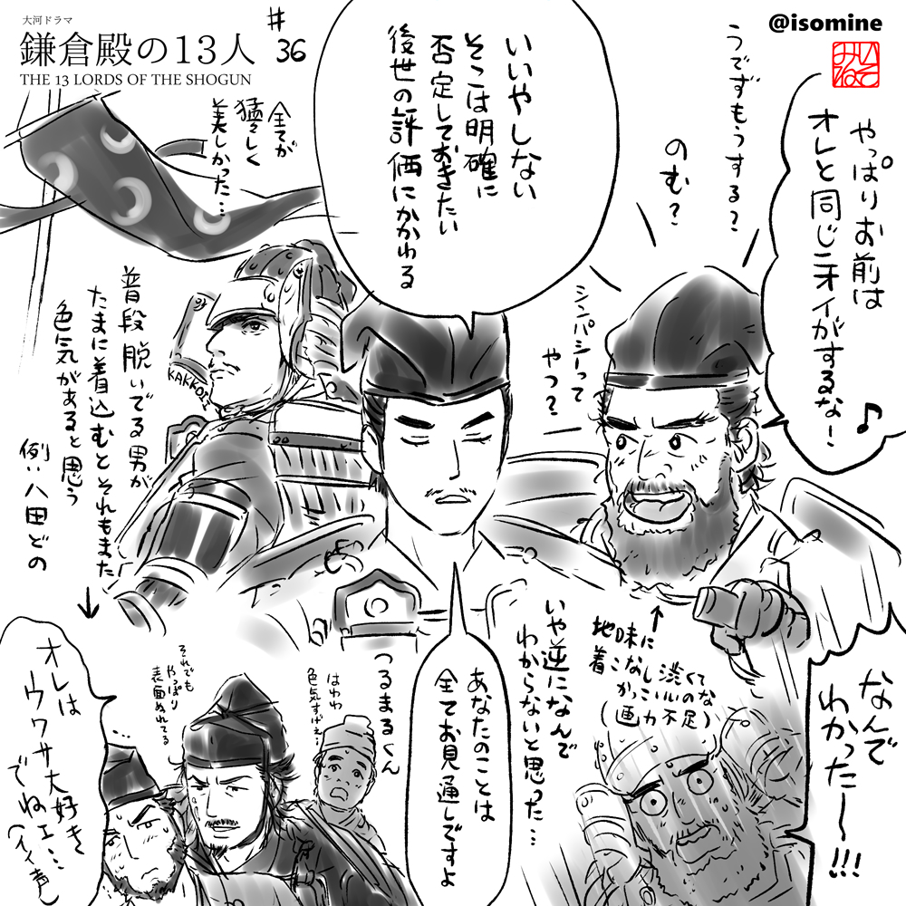 【鎌倉絵/第36回】和田殿が相変わらずで癒やされますね〜☺️小四郎の馬上からジャンピングダイブ→取っ組み合いでビックリした!畠山殿の華々しい最期がカッコよく、悲しい!😭小四郎も謀略のやり方が巧すぎて、とてもコワイ😱
