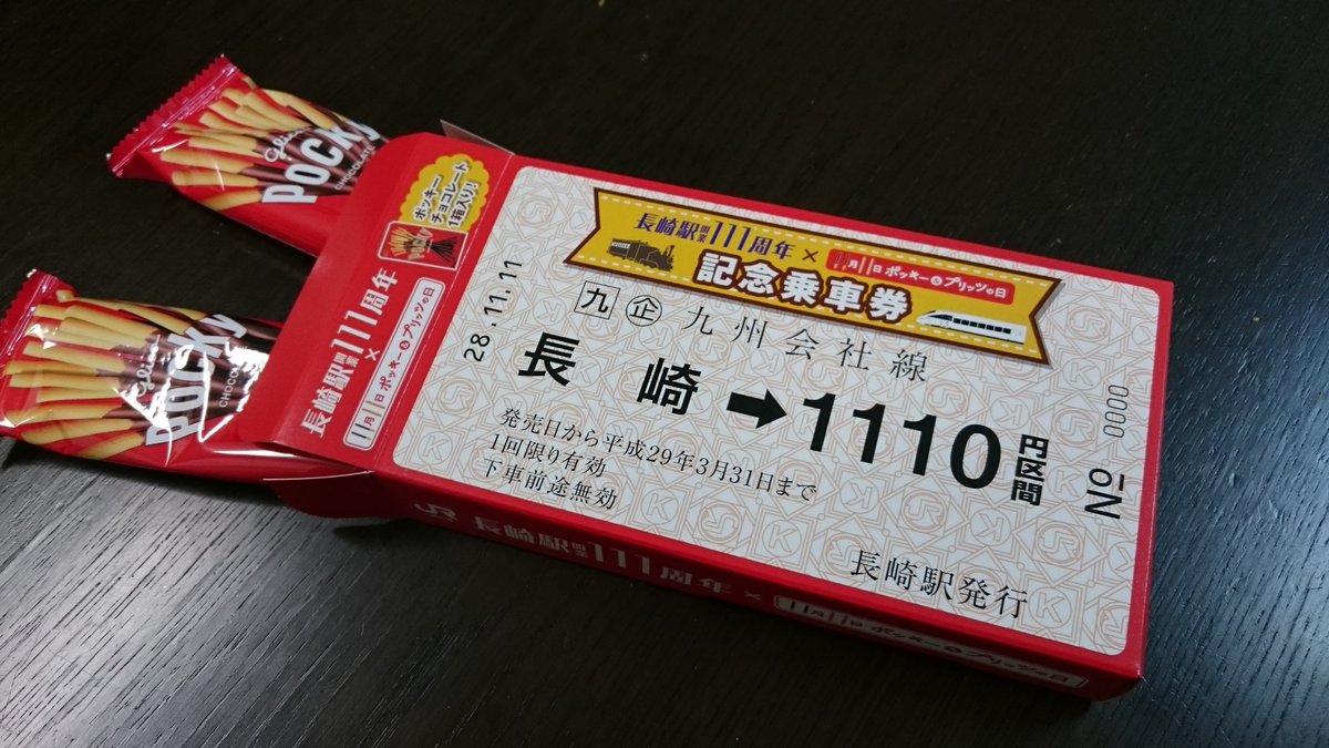 いよいよ明日、ポッキー記念乗車券が発売されるんだねー。 11月11日11時11分に長崎駅で発売開始1110円で1111個発売だよ! #長崎駅111 ちなみに長崎駅発11時11分発の列車もあるんだけど、どこ行きか知ってるかなー?